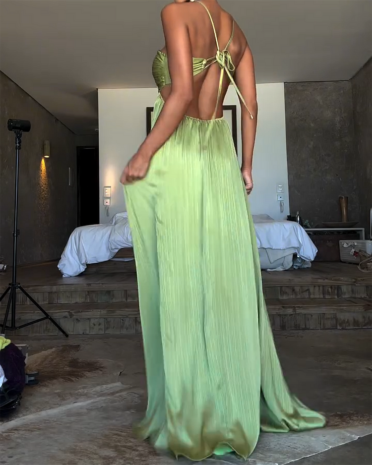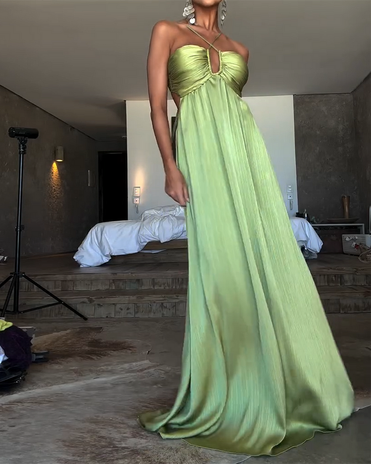 Featuring a delicately ruched bust, open back with adjustable cross straps, and a flowing pleated skirt, this dress captures the light with every movement. The fabric drapes like liquid, giving Aurelia her signature air of understated glamour.