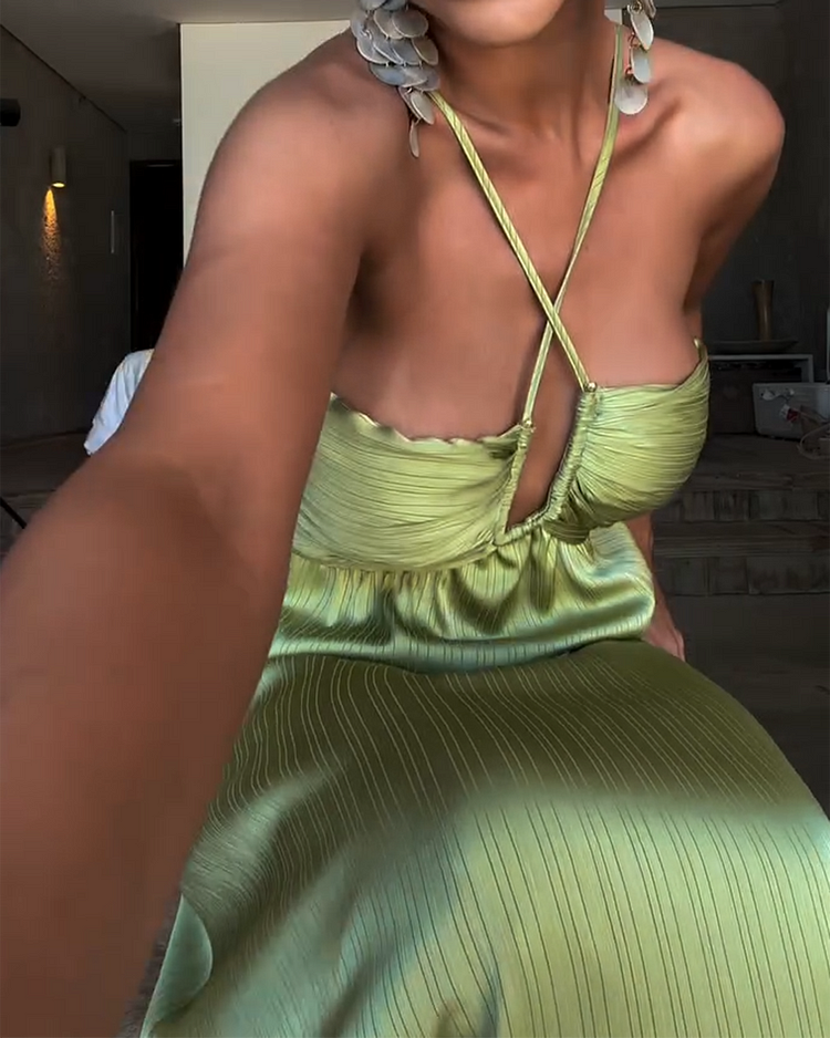 Soft, radiant, and effortlessly striking — the Aurelia Cross-Strap Pleated Dress is designed for golden-hour moments that last all night.